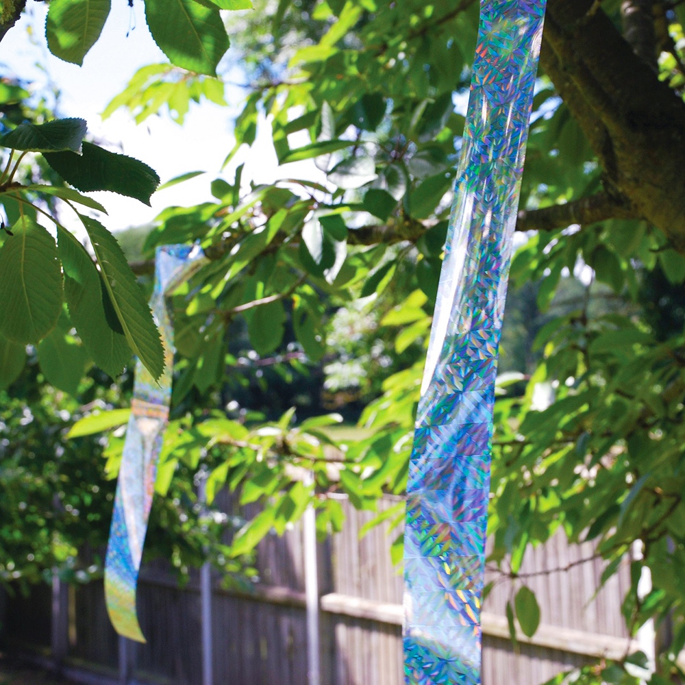 A special silver holographic (reflective) tape to scare away birds. The tape creates an aerial image with diffraction effect and produces a sound as it moves in the wind; this combination of image and sound is very efficient when scaring away birds preventing them from approaching and sitting around orchards, vineyards, gardens, window sills, windows and balconies. ... More