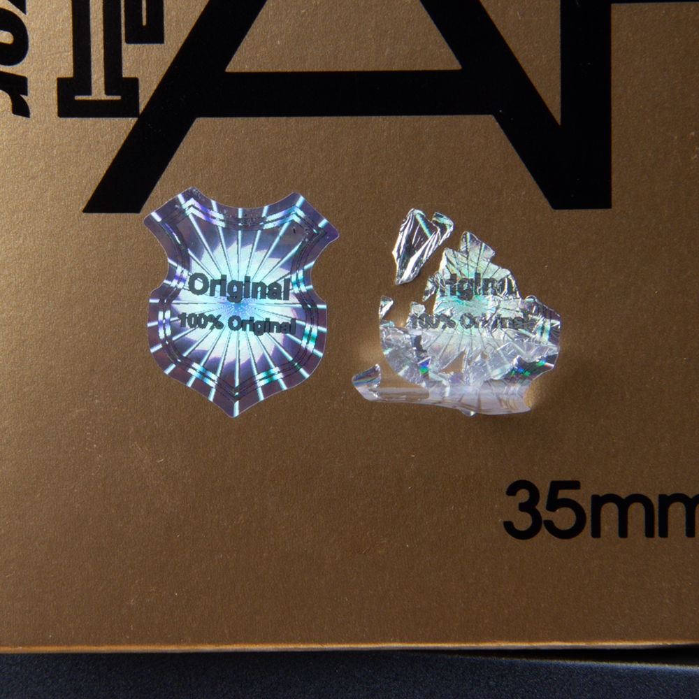 Due to the complex manufacturing process, the multi-layer master holograms are virtually impossible to counterfeit. The bottom hologram layer is a destructive one – it means that, once the sticker is put in place and then removed, the bottom silver layer or a part of it remains on the surface of the package; the hologram sticker cannot be re-stuck once peeled off; when placing the sticker over an edge of a product packaging or an envelope with documents, you gain a security seal that guarantees an originally sealed packaging.