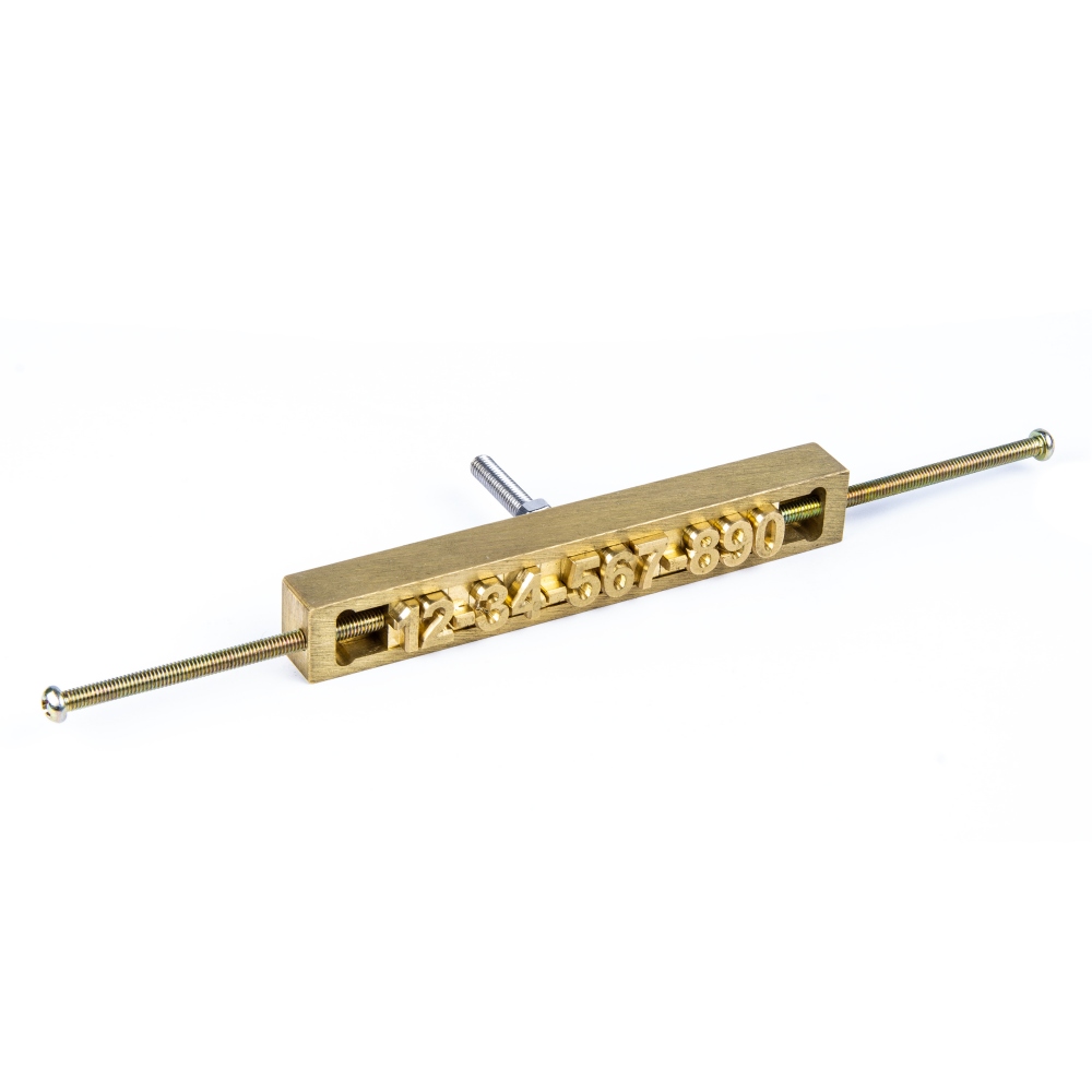 Using this stamping plate, you can stamp numbers into wood, leather, cardboard or plastic. The sort’s dimensions are 110 x 15.8 x 12 mm; the characters are 9.6 mm tall and 4.75 to - 6.75 mm wide (width varies by the numeral). The brass plate has an M5 thread bar in the centre (diameter of ca. 4.85 mm) that holds the plate in the soldering iron or hot stamping press. Given the size of the stamping plate, the soldering iron must be powerful enough in order to heat the entire length of the plate. This product is recommended to be used in combination with the R5 handheld soldering iron or the R8 hot stamping press that we offer.