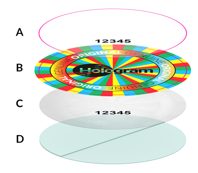 A1) Serial numbersIt is possible to number each security hologram for an extra charge, using thermal transfer print. Serial numbers are printed in ink on the top protective foil of the sticker.