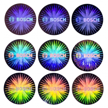 If you need to have the hologram labels serialized, the serial number may be printed in the third layer – hence, you are not limited in your design and can use both holographic layers for pictures, logos, graphics, symbols and text. When thermal transfer printing is used, the serial number is printed on the surface of the label. Laser printing burns the number into the aluminium foil creating a transparent spot in the hologram.