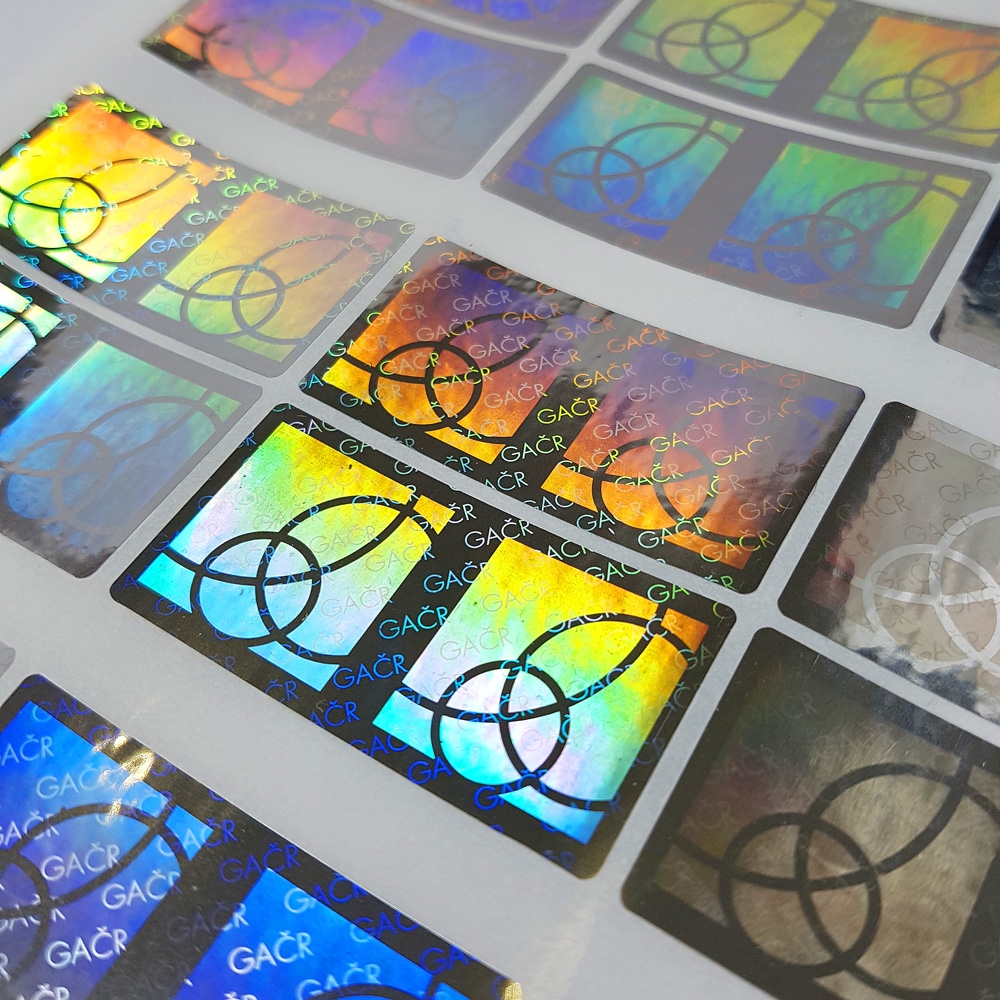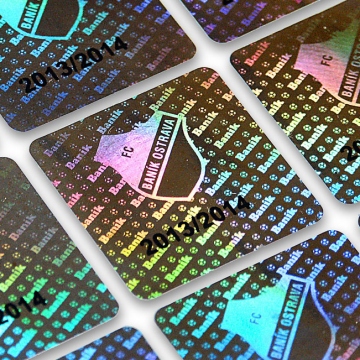 Holograms are printed on aluminium foils of various colours. Silver is the basic and most frequently used colour that makes the hologram very noticeable reflecting all colours of the colour spectrum. The second most frequently used foil is golden. The hologram rainbow effect is less pronounced on golden foil as the blue in the reflection is missing; on the other hand, golden colour comes on as more luxurious. These two foil colours are the basic ones and are provided for the same price. A hologram can be produced in any other foil colour for a fee of at least 40 %. The most luxurious but also the most costly is the black foil hologram (extra fee of 160 % plus).