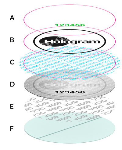 Holographic layers are completely independent and do not disrupt each other visually when observed; for pointing up the graphical manifestation of other layers the label needs to be slightly rotated to the source of light. Graphical data written in other layer than the one observed at that moment will not be visible at all or they will show completely different colour crossings (see the visibility of layers in production manual).