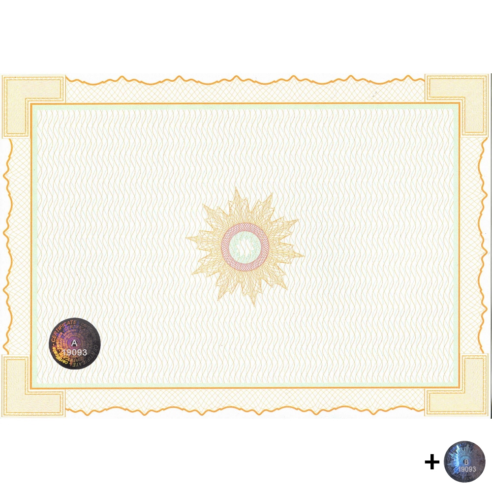 Universal guilloche paper with landscape orientation and embossed numbered hologram and paired hologram on 150 gsm plain bleached paper. This secure printing medium is designed especially for direct printing with a laser printer and thus enables the rapid production of diplomas, certificates of authenticity, certificates of product quality or training certificates, etc. The numbering of the hologram, which is also completely inseparable from the document, represents the ultimate degree of protection.