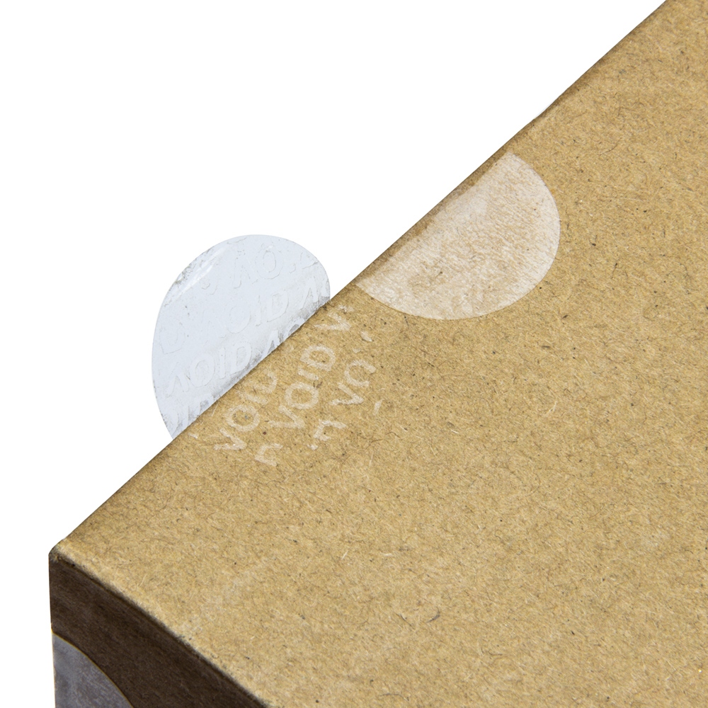 A transparent sticker with a VOID security layer does not attract attention at the first glance; however, once placed on the goods/box and removed, a repetitive inscription VOID shows up both on the surface of the box/packaging and the sticker itself indicating that the packaging sealed with this VOID sticker has been tampered with. By placing this sticker on a document, an envelope or a package you prevent any unauthorized opening, theft or inspection of documents, goods and contracts. When the VOID seal is removed from a box/an envelope, the layer that remains on the paper surface is virtually irremovable and cannot be disguised with a new, intact sticker.